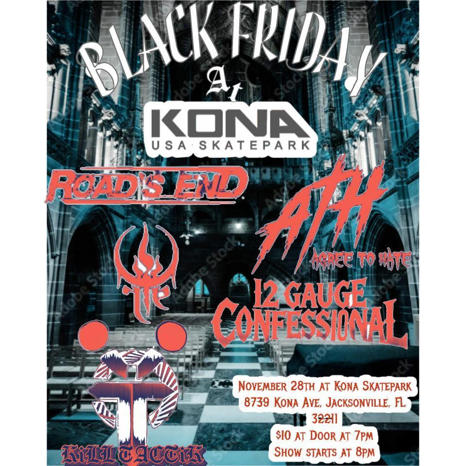 Spend your Black Friday at Kona with Agree To Hate w/ Kill Tactic, 12 Gauge Confessional, Roads End, all ages