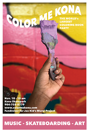 Kona Skate Park is being transformed into the “Worlds Largest” interactive “Coloring Book”. Artists and Muralists throughout the region have joined forces with renowned creator, Nico Holderbaum, to help raise money and awareness for art projects involving underprivileged students and families. Her tireless efforts launched the Jax Kids Mural Project in 2014, which works directly with Duval County Public Schools. She creates art initiatives which inspire and motivate students to seek out positive influences in their communities . . . all through art!