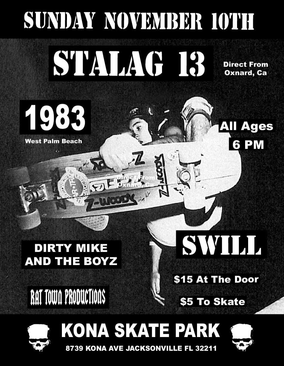 Kona Clubhouse 8739 Kona Ave, Jacksonville, FL, United StatesKona Clubhouse presents Stalag 13, 1983, Dirty Mike and the Boyz, and Swill! Rat Town Productions, all ages