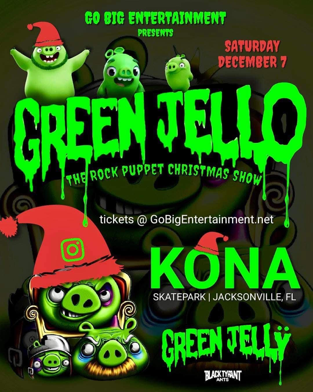 Kona Clubhouse 8739 Kona Ave, Jacksonville, FL, United StatesGreen Jello, the rock puppet Christmas show, at Kona Clubhouse Saturday Dec 7, 2024 $15 show $5 Skate bring your own mask