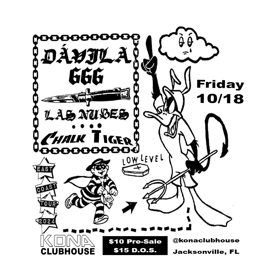 Kona Clubhouse 8739 Kona Ave, Jacksonville, FL, United StatesFriday 10/18 Kona Clubhouse presents Davilla 666, Las Nudes, and Chalk Tiger, $10 presale, $15 day of show, all ages.