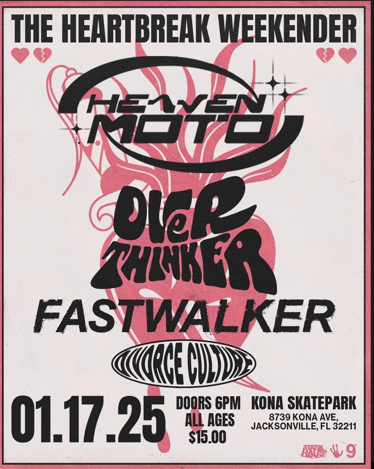 Kona Clubhouse 8739 Kona Ave, Jacksonville, FL, United StatesKona Clubhouse presents The Heartbreaker Weekend featuring Heaven Moto, Over Thinker, Fastwalker, Divorce Culture $15 Doors at 6pm