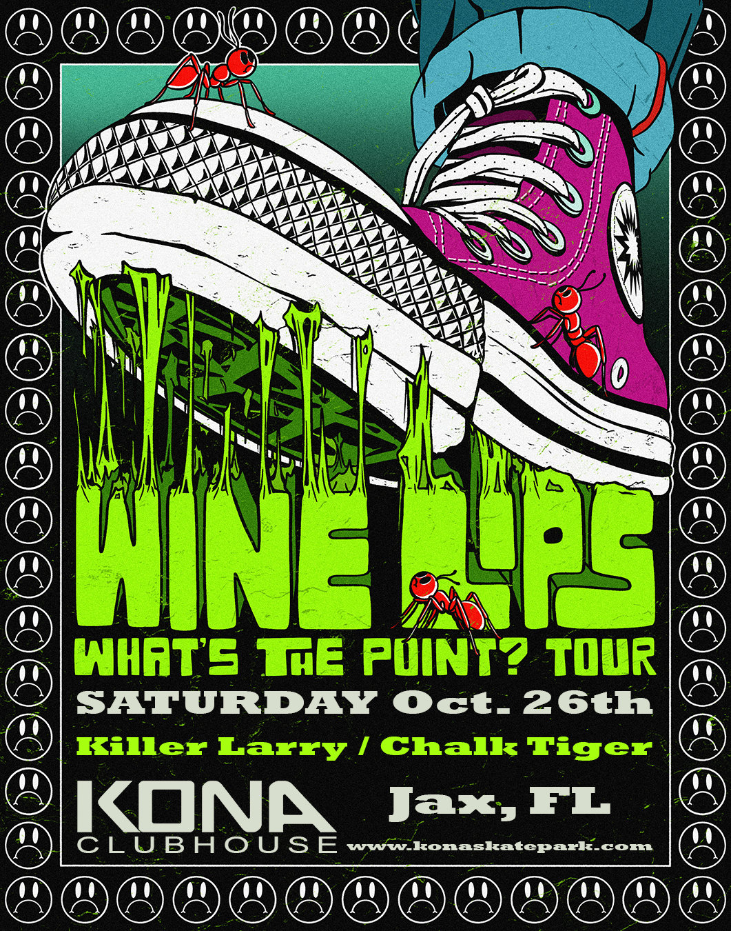 Kona Clubhouse 8739 Kona Ave, Jacksonville, FL, United StatesWine Lips, Killer Larry, and Chalk Tiger play Kona Clubhouse, all ages, beer and wine for adults, $15 presale, $20 day of show